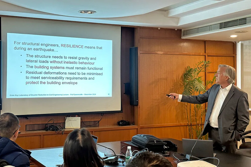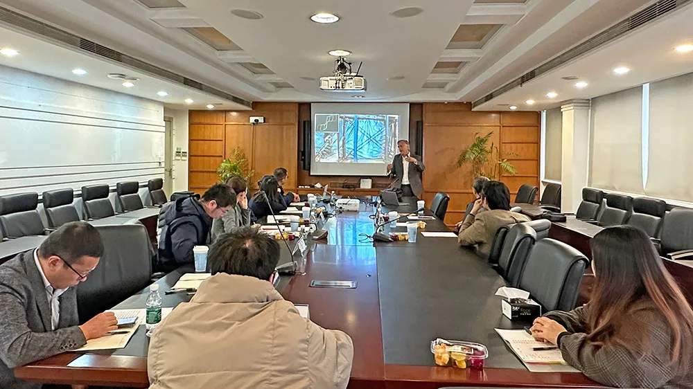 Quenneville教授作了題為《Seismic design of resilient structures —— a perspective》的學(xué)術(shù)報(bào)告,報(bào)告中介紹了韌性摩擦自復(fù)位阻尼器的最新研究進(jìn)展,以及無損傷建筑結(jié)構(gòu)建造和低損傷既有結(jié)構(gòu)加固技術(shù)的工程應(yīng)用案例。結(jié)構(gòu)所副所長(zhǎng)冷予冰介紹了上海建科院的科技創(chuàng)新與發(fā)展情況,以及在工程結(jié)構(gòu)抗震韌性領(lǐng)域開展的研究與技術(shù)服務(wù)。參會(huì)人員與Quenneville教授圍繞自復(fù)位結(jié)構(gòu)及消能減震技術(shù)研究進(jìn)行了深入交流。