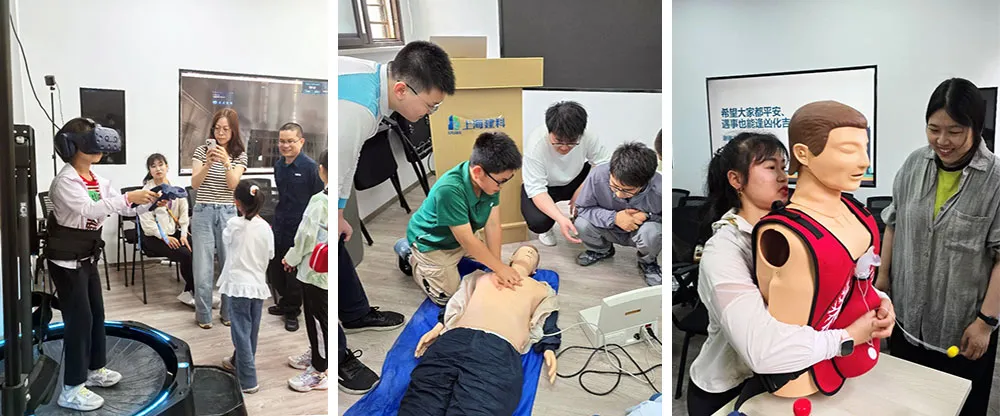 在互動體驗環(huán)節(jié),結(jié)構所青年冷予冰博士、張睿博士、張璐琦博士、宋辭博士,結(jié)構所與職能聯(lián)合團支部書記呂江義、宣傳委員朱斌貝及依托單位技術骨干組成“科普引導團”,帶領參與家庭沉浸式體驗了三大實踐項目——VR火災疏散逃生演習、氣道異物梗阻急救實操和心肺復蘇實操。