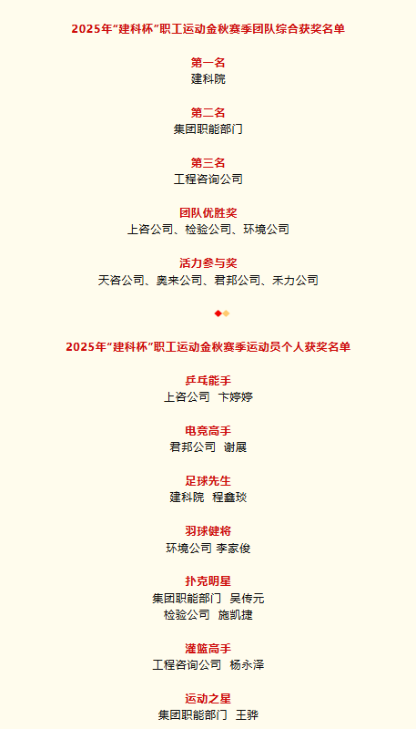 現(xiàn)場(chǎng)榮耀時(shí)刻,隆重揭曉并頒發(fā)了2025年“建科杯”職工運(yùn)動(dòng)金秋賽季團(tuán)隊(duì)綜合排名相關(guān)獎(jiǎng)項(xiàng)和運(yùn)動(dòng)員個(gè)人榮譽(yù)獎(jiǎng)項(xiàng)。建科院、集團(tuán)職能部門(mén)、工程咨詢(xún)公司獲得綜合排名前三名。