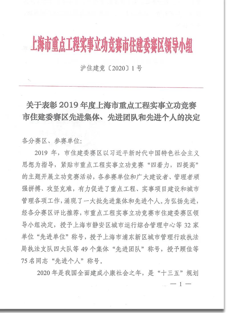 2019年度上海市重點(diǎn)工程實(shí)事立功競(jìng)賽市住建委賽區(qū)先進(jìn)集體、先進(jìn)團(tuán)隊(duì)和先進(jìn)個(gè)人頒布,上海市建筑科學(xué)研究院建筑結(jié)構(gòu)與維護(hù)改造研究所榮獲“2019年度上海市重點(diǎn)工程實(shí)事立功競(jìng)賽市住建委賽區(qū)先進(jìn)團(tuán)隊(duì)”稱號(hào)!