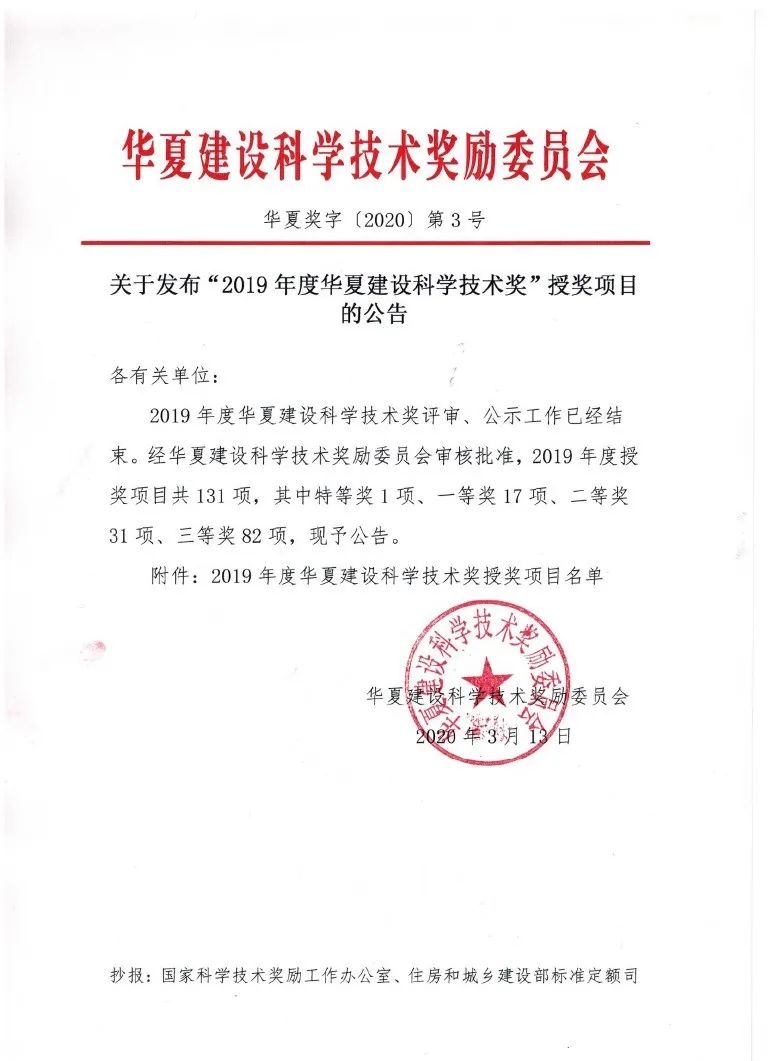 2019年度華夏建設(shè)科學(xué)技術(shù)獎項(xiàng)目名單公布,共授獎131項(xiàng),其中特等獎1項(xiàng)、一等獎17項(xiàng)、二等獎31項(xiàng)、三等獎82項(xiàng)。