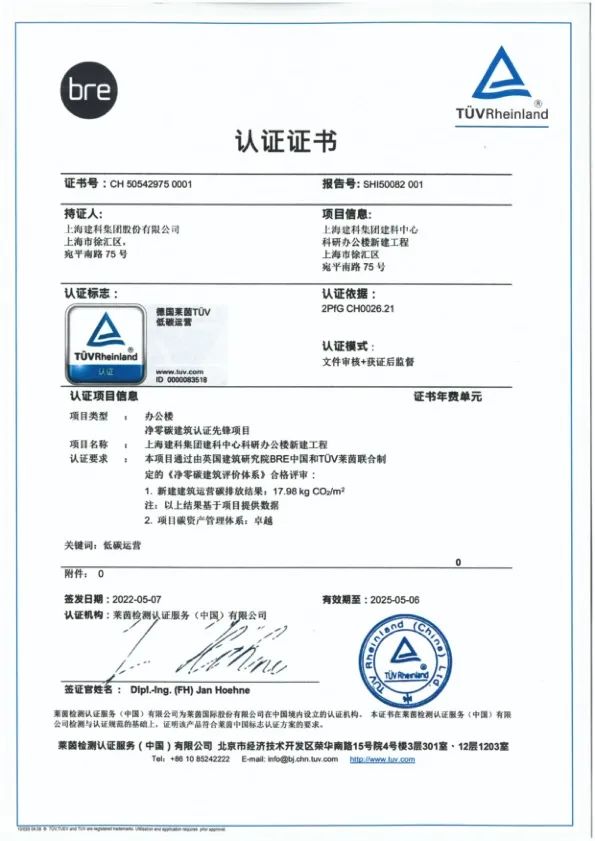 2022年4月,上海建科集團建科中心科研辦公樓新建工程順利通過英國建筑研究院BRE與德國TüV萊茵聯(lián)合制定頒布的凈零碳建筑評價體系認證,成為中國首批凈零碳建筑認證先鋒項目。