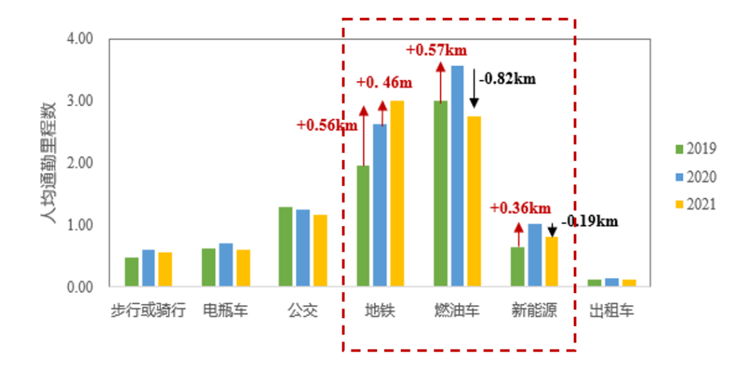 員工通勤碳排放變化分析:從各通勤方式年總里程來(lái)看:從2019年到2021年,地鐵年通勤里程增長(zhǎng)280%,自駕燃油車(chē)?yán)锍淘鲩L(zhǎng)137%,自駕新能源車(chē)?yán)锍淘鲩L(zhǎng)19.1%。