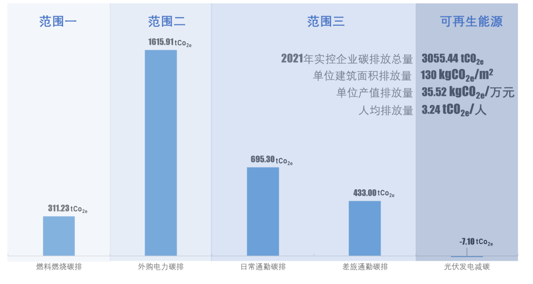 碳排放總體情況:2021年碳排放總量3055tCO2e;排放類(lèi)別以范圍二外購(gòu)電力排放量為主,占53%;檢測(cè)檢驗(yàn)類(lèi)業(yè)務(wù)的萬(wàn)元產(chǎn)值碳排放量最高,設(shè)計(jì)咨詢類(lèi)業(yè)務(wù)的萬(wàn)元產(chǎn)值碳排放量最低。