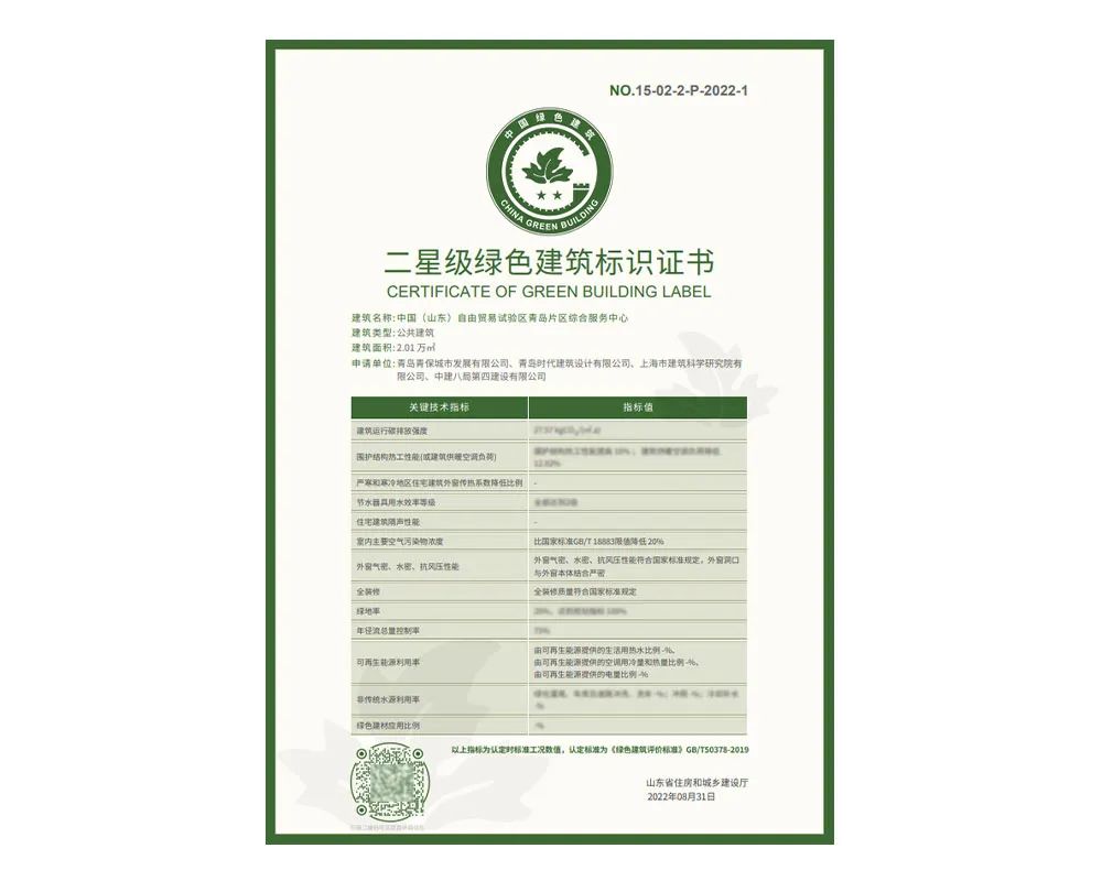 2022年8月23日,由上海市建筑科學(xué)研究院有限公司青島團隊提供技術(shù)服務(wù)的中國(山東)自由貿(mào)易試驗區(qū)青島片區(qū)綜合服務(wù)中心項目榮獲山東省住房和城鄉(xiāng)建設(shè)廳頒發(fā)的“二星級綠色建筑標識證書”,成為山東省首個《綠色建筑評價標準》(GB/T 50378-2019)二星級綠色公共建筑認證項目。