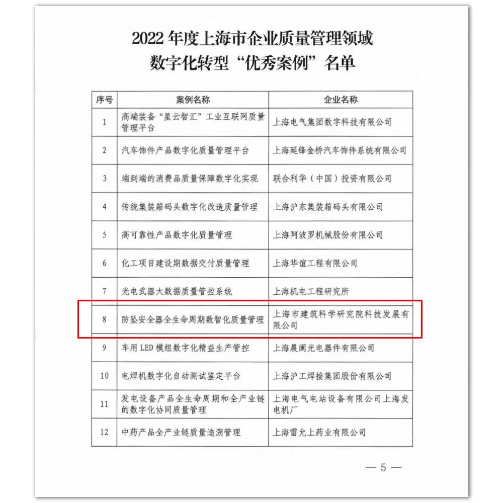 近日,上海市質(zhì)量工作領(lǐng)導(dǎo)小組辦公室發(fā)布了2022年度上海市企業(yè)質(zhì)量管理領(lǐng)域數(shù)字化轉(zhuǎn)型“優(yōu)秀案例”名單,共有20家單位入榜。上海市建筑科學(xué)研究院有限公司下屬上海市建筑科學(xué)研究院科技發(fā)展有限公司(以下簡稱科技公司)申報的“防墜安全器全生命周期數(shù)智化質(zhì)量管理”案例成功入選,也是金山區(qū)唯一一家榮獲優(yōu)秀案例的企業(yè)。