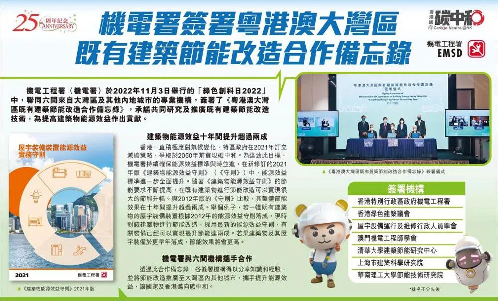 此次合作備忘錄簽署,是7家機構繼2018年簽署建筑物重新校驗(再調適)合作備忘錄之后的再度攜手。目的是根據簽署機構在既有建筑節(jié)能改造(Building Energy Saving Retrofit)的知識和經驗,締結協(xié)同作用,以促進及推廣粵港澳大灣區(qū)內既有建筑節(jié)能改造優(yōu)良實踐方案,并共同研究及推廣既有建筑節(jié)能改造技術到國內其他地區(qū),以優(yōu)化建筑物能源效益,并減少建筑物的能源消耗及碳排放。