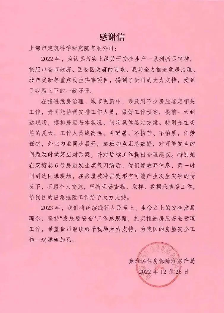 近日,南京市秦淮區(qū)住房保障和房產局發(fā)來感謝信,向上海市建筑科學研究院有限公司南京辦事處在危房治理、事故應急等重點民生實事項目中的大力支持給予了充分肯定并表示感謝。