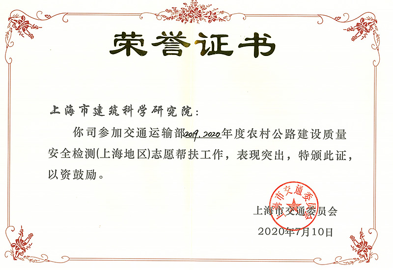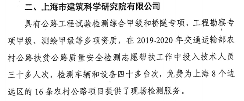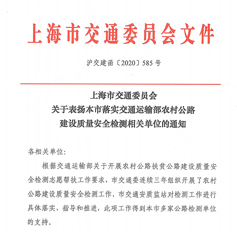 2020年9月29日,上海市交通委員會組織召開農(nóng)村公路建設(shè)工作會議。會上,上海市建筑科學(xué)研究院有限公司作為農(nóng)村公路建設(shè)質(zhì)量安全檢測(上海地區(qū))志愿幫扶單位,因工作表現(xiàn)突出成為受到市交通委通報表揚(yáng)的三家單位之一。