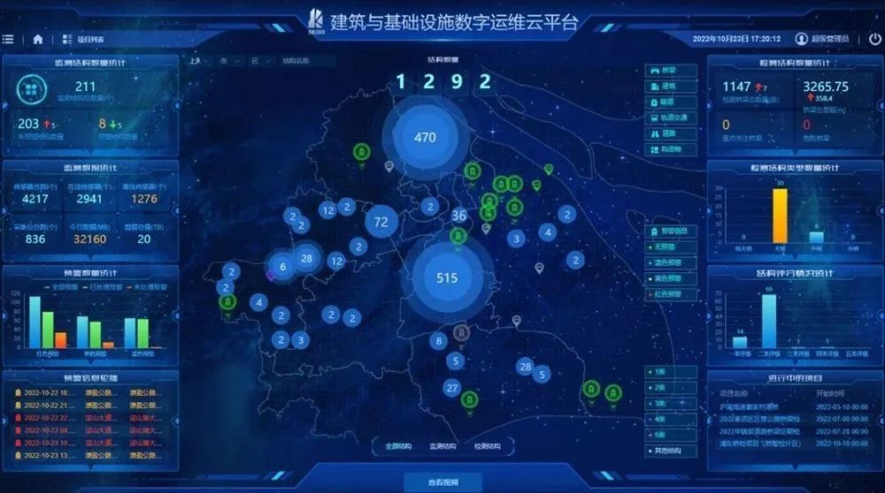 上海建科院研發(fā)的“交通基礎(chǔ)設(shè)施數(shù)字化運(yùn)維云平臺(tái)”,基于數(shù)字孿生技術(shù),融合檢測(cè)、監(jiān)測(cè)、養(yǎng)護(hù)和管理多源數(shù)據(jù),對(duì)單體設(shè)施和設(shè)施集群進(jìn)行實(shí)時(shí)監(jiān)測(cè)、評(píng)估、預(yù)警和輔助決策,實(shí)現(xiàn)超大型城市交通基礎(chǔ)設(shè)施運(yùn)營(yíng)安全的“一屏觀管防”。