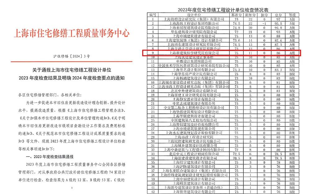 近日,上海市住宅修繕工程設(shè)計(jì)單位2023年度檢查結(jié)果正式揭曉,上海市建筑科學(xué)研究院有限公司從74家設(shè)計(jì)單位中脫穎而出,成功獲評(píng)A級(jí)單位。