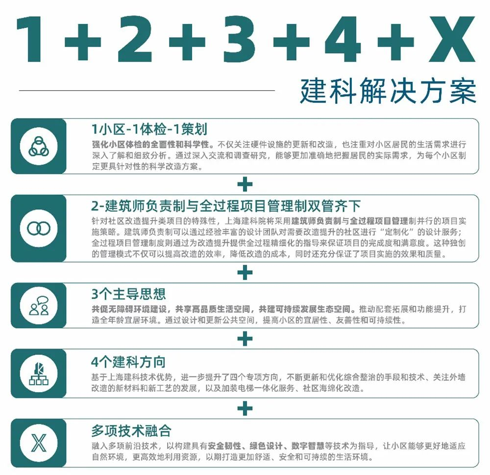 上海建科院以宜居便利、文脈傳承、智能智慧、安全韌性、經(jīng)濟(jì)節(jié)約、綠色低碳為六大目標(biāo),基于“設(shè)計(jì)+”模式,通過“體檢先行、專項(xiàng)提升、系統(tǒng)治理”的工作機(jī)制,建立了系統(tǒng)成熟的【1+2+3+4+X】建科“未來社區(qū)系統(tǒng)解決方案”,為上海400余處老舊小區(qū)提供了美麗家園綜合治理、加裝電梯、外墻節(jié)能改造、海綿專項(xiàng)提升等服務(wù),全面改善提升老舊小區(qū)的房屋、配套設(shè)施、公共區(qū)域等,助力完善城市人居環(huán)境質(zhì)量,增強(qiáng)人民群眾的獲得感、幸福感、安全感。