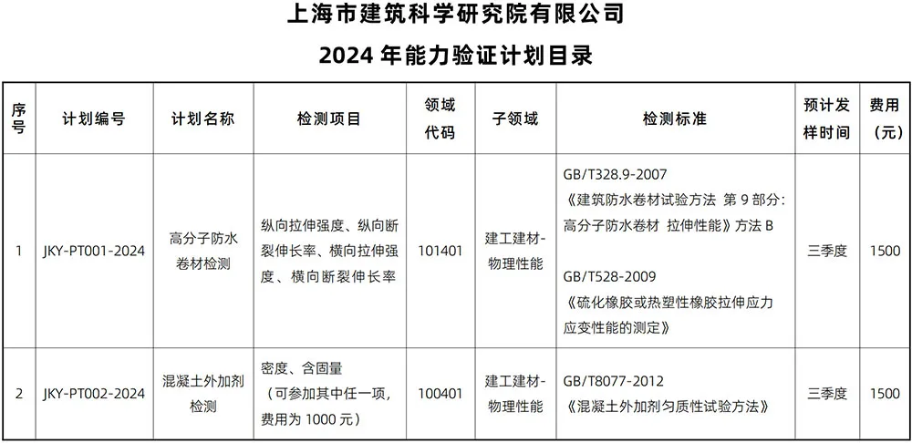 上海建科院2024年能力驗(yàn)證計(jì)劃火熱報(bào)名中,計(jì)劃涉及防水卷材、外加劑領(lǐng)域,具體詳見(jiàn)《2024年能力驗(yàn)證計(jì)劃目錄》。