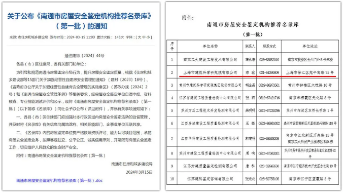為引導(dǎo)和規(guī)范南通市房屋鑒定市場(chǎng)行為,提升房屋安全鑒定質(zhì)量,江蘇省南通市住房和城鄉(xiāng)建設(shè)局近期組織開(kāi)展了“南通市房屋安全鑒定機(jī)構(gòu)推薦名錄”的征集工作。經(jīng)過(guò)多輪次考核,上海市建筑科學(xué)研究院有限公司以過(guò)硬的技術(shù)實(shí)力和優(yōu)異的考核成績(jī)?nèi)脒x第一批推薦名錄,也是此次名錄中唯一的非江蘇省鑒定單位。
