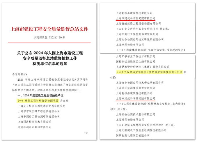 3月7日,上海市建設(shè)工程安全質(zhì)量監(jiān)督總站通過公開招標(biāo)方式確定了2024年市安質(zhì)監(jiān)總站監(jiān)督抽檢單位入圍名單。上海市建筑科學(xué)研究院有限公司同時(shí)入選建筑工程材料監(jiān)督檢測(cè)及工程實(shí)體監(jiān)督檢測(cè)(套筒灌漿飽滿度檢測(cè))2個(gè)項(xiàng)目。