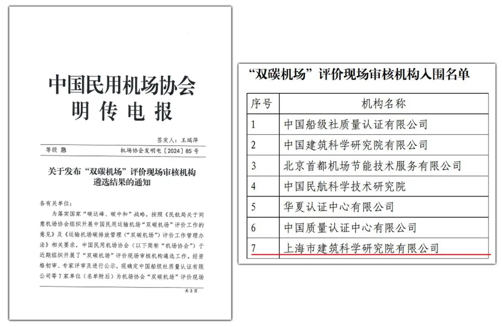 5月29日,中國民用機(jī)場協(xié)會(huì)發(fā)布了 “雙碳機(jī)場”評(píng)價(jià)現(xiàn)場審核機(jī)構(gòu)遴選結(jié)果的通知,上海市建筑科學(xué)研究院有限公司正式入選中國民用機(jī)場協(xié)會(huì)“雙碳機(jī)場”評(píng)價(jià)現(xiàn)場審核機(jī)構(gòu)。