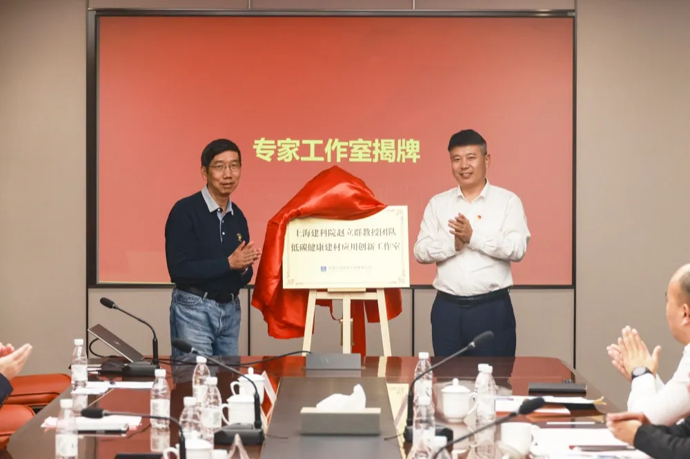 葛杰與上海建科院原副總工程師趙立群共同為“低碳健康建材應(yīng)用創(chuàng)新專家工作室”揭牌。