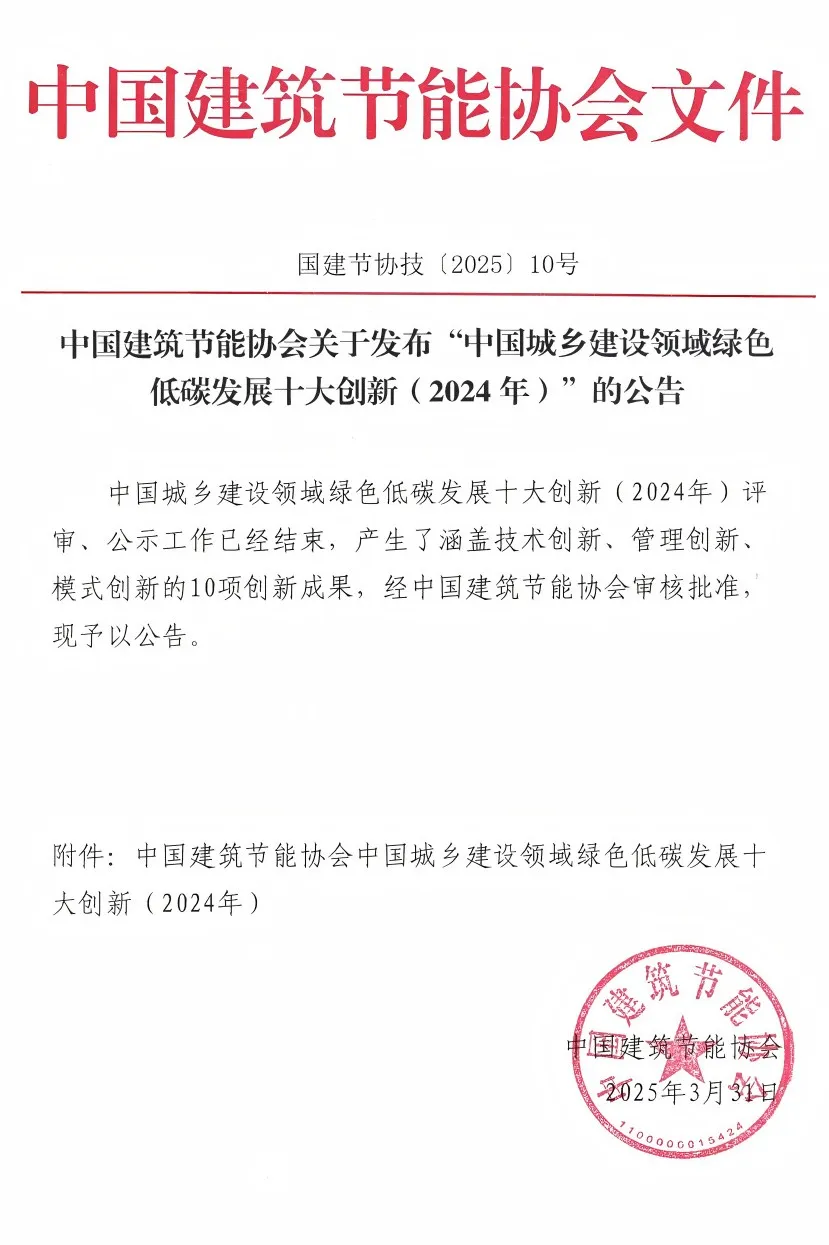 中國建筑節(jié)能協(xié)會組織開展的“中國城鄉(xiāng)建設(shè)領(lǐng)域綠色低碳發(fā)展十大創(chuàng)新(2024年)”評選活動,旨在貫徹落實(shí)黨中央國務(wù)院關(guān)于加快推動經(jīng)濟(jì)社會全面綠色轉(zhuǎn)型的決策部署,通過科技創(chuàng)新和管理創(chuàng)新引領(lǐng)城鄉(xiāng)建設(shè)領(lǐng)域綠色轉(zhuǎn)型。該活動面向高校、科研院所、行業(yè)頭部企業(yè)及院士、勘察設(shè)計(jì)大師等專家廣泛征集創(chuàng)新成果,經(jīng)嚴(yán)格評審,最終遴選出對2024年中國城鄉(xiāng)建設(shè)領(lǐng)域綠色低碳發(fā)展最具影響力和示范性的十大創(chuàng)新成果。
