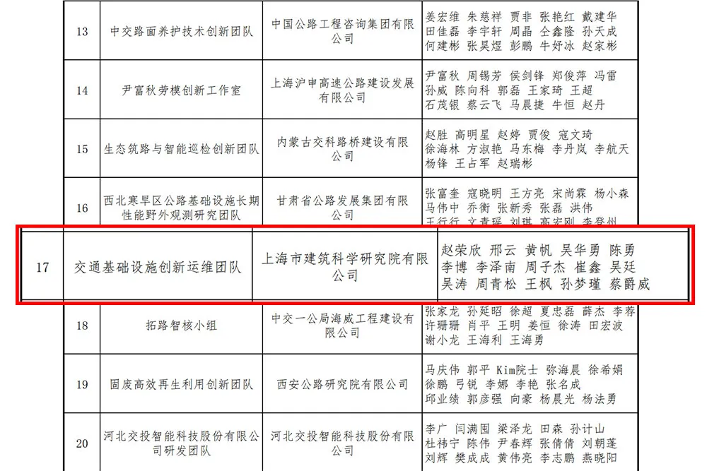 近日,首屆“茅以升路橋工程師創(chuàng)新團(tuán)隊(duì)”評選結(jié)果揭曉,上海建科院黨委副書記、總經(jīng)理趙榮欣領(lǐng)銜的交通基礎(chǔ)設(shè)施創(chuàng)新運(yùn)維團(tuán)隊(duì)?wèi){借在智能運(yùn)維領(lǐng)域的開創(chuàng)性成就,從全國頂尖團(tuán)隊(duì)中脫穎而出,榮膺首屆“茅以升路橋工程師創(chuàng)新團(tuán)隊(duì)”稱號。