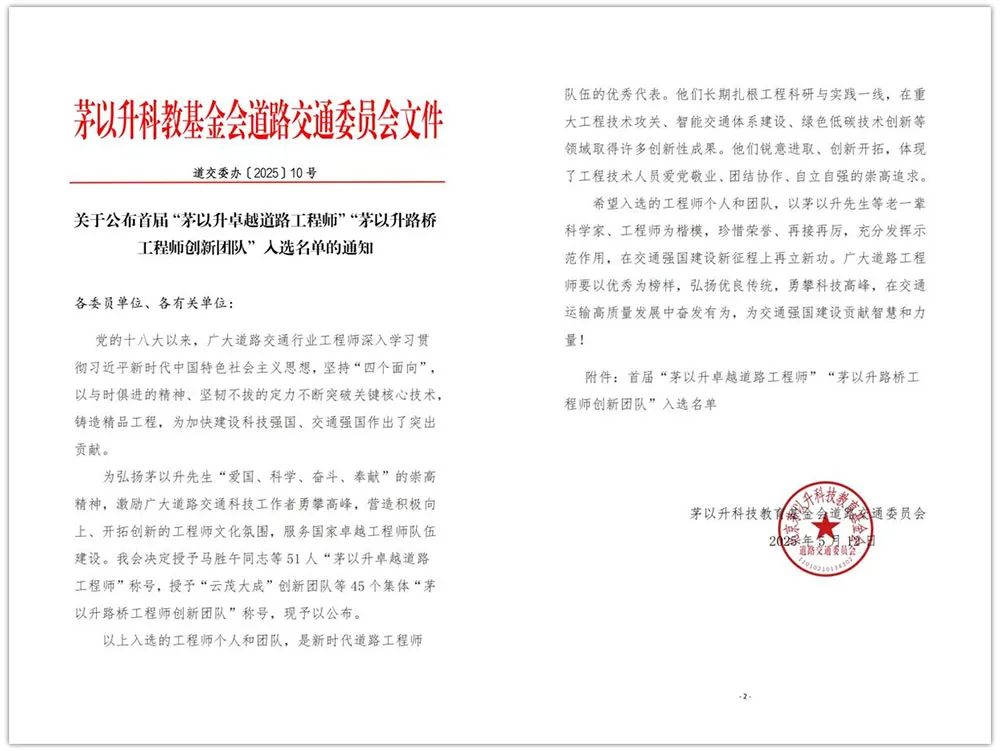“茅以升路橋工程師創(chuàng)新團(tuán)隊(duì)”由茅以升科技教育基金會道路交通委員會組織評選,旨在傳承茅以升先生“愛國、科學(xué)、奮斗、奉獻(xiàn)”的精神火炬,激發(fā)道路交通科技工作者勇攀科技高峰的壯志豪情,厚植“敢為人先、追求卓越”的工程師文化沃土,助力國家卓越工程師戰(zhàn)略實(shí)施。