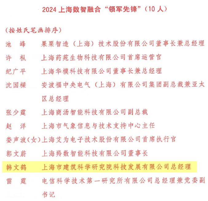 近日,由上海市總工會(huì)、上海市經(jīng)濟(jì)信息化工作黨委、上海市經(jīng)濟(jì)信息化委共同舉辦的2024上海數(shù)智融合“智慧工匠”選樹、“領(lǐng)軍先鋒”評(píng)選活動(dòng)圓滿收官。歷經(jīng)初審篩選、專家復(fù)審、決賽評(píng)選及公示等嚴(yán)格環(huán)節(jié),十位“領(lǐng)軍先鋒”最終脫穎而出。其中,上海市建筑科學(xué)研究院有限公司韓文鶴榮獲“上海市數(shù)智融合領(lǐng)軍先鋒”稱號(hào)。