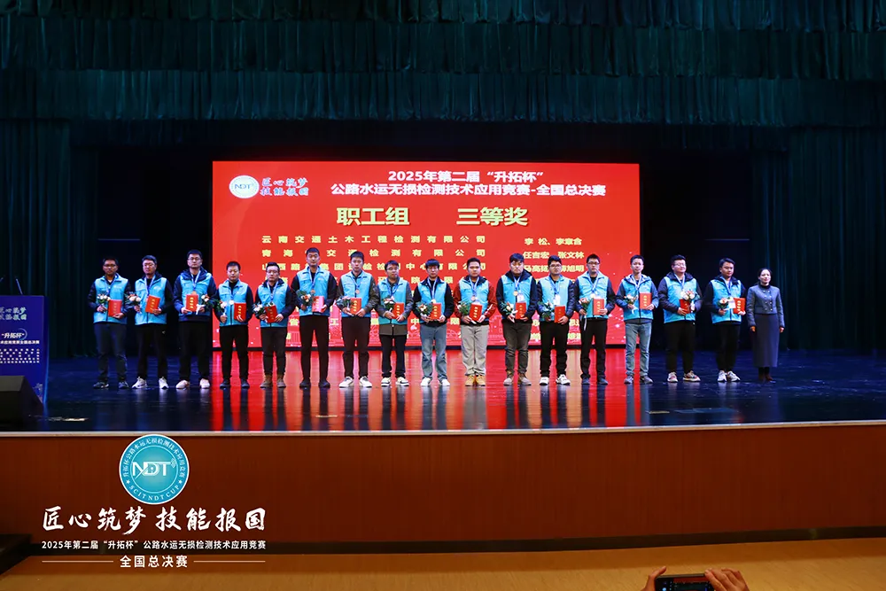 2025年第二屆“升拓杯”公路水運無損檢測技術(shù)應用競賽全國總決賽近日在蘭州圓滿落幕。本屆大賽由交通運輸部職業(yè)資格中心主辦,吸引了來自全國27個省(自治區(qū)、直轄市)、新疆生產(chǎn)建設(shè)兵團,以及中國中鐵、中國交建、葛洲壩集團、中鋼集團等單位。經(jīng)過各區(qū)域預選賽的層層篩選與激烈角逐,最終119支代表隊站上全國總決賽的舞臺,其中職工組匯聚了46支行業(yè)頂尖隊伍,圍繞5個一等獎、10個二等獎、15個三等獎的榮譽展開角逐。經(jīng)過激烈角逐,上海市建筑科學研究院有限公司交通團隊成功斬獲職工組三等獎。