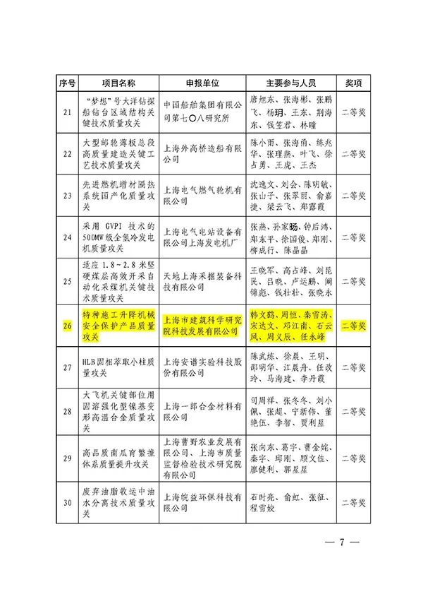 《特種施工升降機械安全保護(hù)產(chǎn)品質(zhì)量攻關(guān)》項目榮獲2025年度上海市重點產(chǎn)品質(zhì)量攻關(guān)成果二等獎。該項目成功研制高速重載、超低速、自復(fù)位漸進(jìn)式等6大系列防墜安全器,為我國施工升降機械安全保護(hù)和行業(yè)質(zhì)量升級提供了堅實支撐。