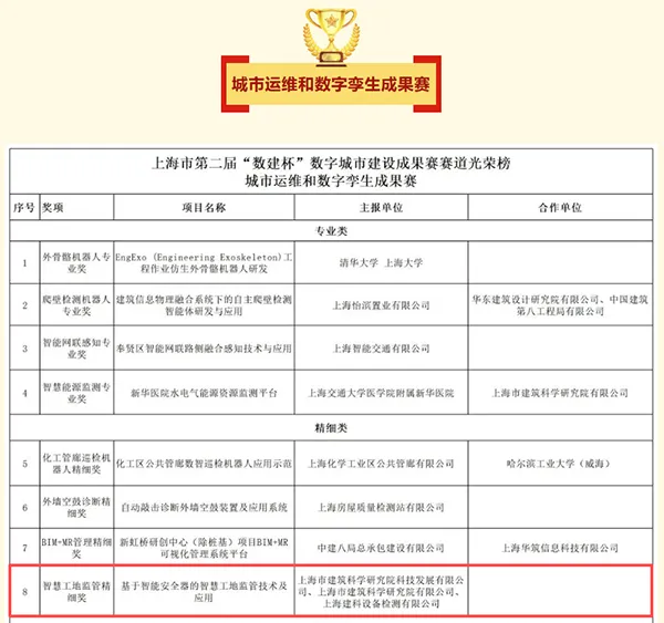《基于智能安全器的智慧工地監(jiān)管技術(shù)及應(yīng)用》項目榮獲上海市第二屆“數(shù)建杯”數(shù)字城市建設(shè)成果賽“智慧工地監(jiān)管精細(xì)類專項獎”。該項目實現(xiàn)施工安全的可視化、數(shù)字化與遠(yuǎn)程診斷,有效推動建筑機械安全管理從“經(jīng)驗驅(qū)動”向“數(shù)據(jù)驅(qū)動”的轉(zhuǎn)變。