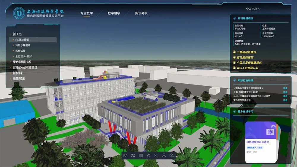 作為項(xiàng)目重要成果,實(shí)訓(xùn)平臺(tái)以特定綠色建筑高精度BIM模型為實(shí)訓(xùn)對(duì)象,通過全景漫游、專業(yè)教學(xué)、數(shù)字樓宇和實(shí)訓(xùn)考核等方式,面向多種用戶,實(shí)現(xiàn)了綠色建筑和建筑節(jié)能專業(yè)知識(shí)在線學(xué)習(xí)、綠色建筑數(shù)字化表達(dá)和統(tǒng)計(jì)分析、綠色建筑日常典型運(yùn)維管理情景仿真實(shí)訓(xùn)和考核等功能應(yīng)用,采用沉浸體驗(yàn)、主動(dòng)巡查、專業(yè)答題、仿真操作等方式,實(shí)現(xiàn)引導(dǎo)用戶“做中學(xué),學(xué)中做,邊做邊學(xué),寓教于樂”的效果。