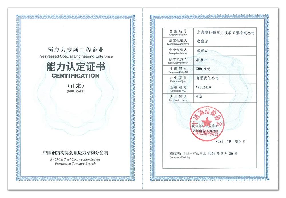 近期,中國鋼結(jié)構(gòu)協(xié)會預(yù)應(yīng)力結(jié)構(gòu)分會組織行業(yè)專家對上海建科預(yù)應(yīng)力技術(shù)工程有限公司(以下簡稱“預(yù)應(yīng)力公司”)的預(yù)應(yīng)力工程施工能力開展評定,從技術(shù)裝備、人員配置、財(cái)務(wù)狀況、工程業(yè)績、科學(xué)管理和質(zhì)量保證體系等方面進(jìn)行了全面考察,并授予預(yù)應(yīng)力公司預(yù)應(yīng)力專項(xiàng)工程甲級企業(yè)能力認(rèn)證證書。根據(jù)預(yù)應(yīng)力專項(xiàng)工程甲級企業(yè)承包工程范圍的規(guī)定,預(yù)應(yīng)力公司可承擔(dān)各類預(yù)應(yīng)力工程的施工。